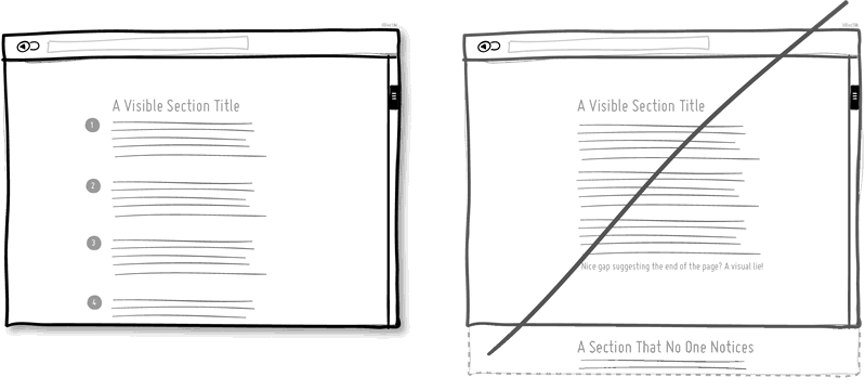 UI 設計師可以建立一種固定的視覺模式或節奏,例如圖標或是小動畫,來引導使用者「網頁還沒看完,下面還有內容」。設計時也需注意欄位之間留白區域的尺寸:過大的空隙會讓人誤以為已經沒有內容了。